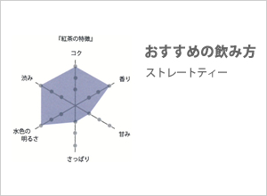 - スリランカ、インド産の高級品質茶葉をブレンドしています。別名ロイヤルリーフと呼ばれ、上品な渋みが心地よくまろやかな味わいです。ほのかに自然な甘みが残ります。